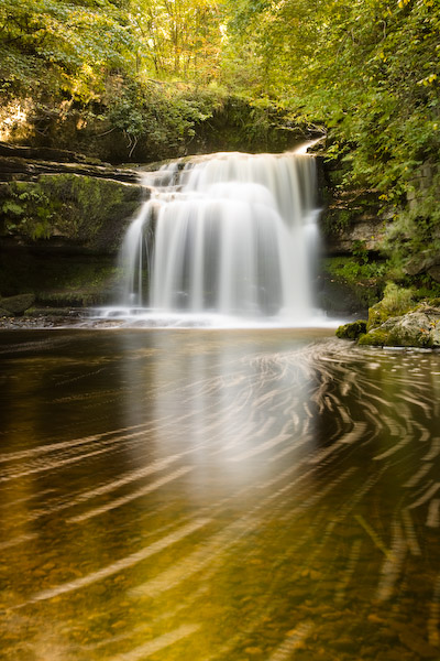West Burton in gentle flow surrounded by the autumn turn, Wensleydale